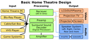 Home cinema designs and layouts are a personal choice and the type of home cinema a user can set up depends on her/his budget and the space which is available within the home. The minimum set of requirements for a home theater are: a large television set or good quality video projector CRT (no new models sold in U.S.), LCD, Digital Light Processing (DLP), plasma display, organic light-emitting diode (OLED), Silicon X-tal Reflective Display (SXRD), Laser TV, rear-projection TV, video projector, Standard-definition television (SDTV), HDTV, or 3D-TV at least 27 inches (69 cm) measured diagonally, an AV receiver or pre-amplifier (surround processor) and amplifier combination capable of at least stereo sound but preferably 5.1 Channel Dolby Digital and DTS audio, and something that plays or broadcasts movies in at least stereo sound such as a VHS HI-FI VCR, LaserDisc player (no new stand-alone models of either are available; VHS VCRs are usually bundled in combo decks with DVD players), a DVD player, a Blu-ray disc player, cable or satellite receiver, video game console, etc. Finally, a set of speakers, at least two, are needed but more common are anywhere from six to eight with a subwoofer for bass or low-frequency effects.[4]