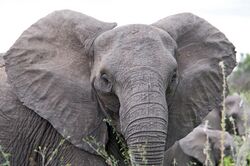 Elephants typically coexist peacefully with other herbivores, which will usually stay out of their way. Some aggressive interactions between elephants and rhinoceros have been recorded. At Aberdare National Park, Kenya, a rhino attacked an elephant calf and was killed by the other elephants in the group.[85] At Hluhluwe–Umfolozi Game Reserve, South Africa , introduced young orphan elephants went on a killing spree that claimed the lives of 36 rhinos during the 1990s, but ended with the introduction of older males.[92] The size of adult elephants makes them nearly invulnerable to predators.[83] Calves may be preyed on by lions, spotted hyenas, and wild dogs in Africa[93] and tigers in Asia.[83] The lions of Savuti, Botswana, have adapted to hunting elephants, mostly calves, juveniles or even sub-adults, during the dry season, and a pride of 30 lions has been normally recorded killing juvenile individuals between the ages of four and eleven years, and a young bull of about 15 years in an exceptional case.[94][95] There are rare reports of adult Asian elephants falling prey to tigers.[96] Elephants appear to distinguish between the growls of larger predators like tigers and smaller predators like leopards (which have not been recorded killing calves); they react to leopards less fearfully and more aggressively.[97] Elephants tend to have high numbers of parasites, particularly nematodes, compared to other herbivores. This is due to lower predation pressures that would otherwise kill off many of the individuals with significant parasite loads.[98]