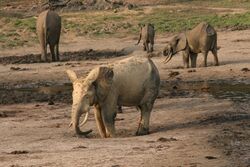 Among African elephants, forest elephants have smaller and more rounded ears and thinner and straighter tusks than bush elephants and are limited in range to the forested areas of western and Central Africa.[12] Both were traditionally considered a single species, Loxodonta africana, but molecular studies have affirmed their status as separate species.[13][14][15] In 2017, DNA sequence analysis showed that L. cyclotis is more closely related to the extinct Palaeoloxodon antiquus, than it is to L. africana, possibly undermining the genus Loxodonta as a whole.[16]