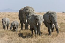 Female elephants spend their entire lives in tight-knit matrilineal family groups, some of which are made up of more than ten members, including three mothers and their dependent offspring, and are led by the matriarch which is often the eldest female.[99] She remains leader of the group until death[93] or if she no longer has the energy for the role;[100] a study on zoo elephants showed that when the matriarch died, the levels of faecal corticosterone ('stress hormone') dramatically increased in the surviving elephants.[101] When her tenure is over, the matriarch's eldest daughter takes her place; this occurs even if her sister is present.[93] One study found that younger matriarchs are more likely than older ones to under-react to severe danger.[102] Family groups may split after becoming too large for the available resources.[103]