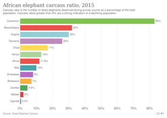 The ban allowed the elephant to recover in parts of Africa.[153] In January 2012, 650 elephants in Bouba Njida National Park, Cameroon, were killed by Chadian raiders.[155] This has been called "one of the worst concentrated killings" since the ivory ban.[154] Asian elephants are potentially less vulnerable to the ivory trade, as females usually lack tusks. Still, members of the species have been killed for their ivory in some areas, such as Periyar National Park in India.[150] China was the biggest market for poached ivory but announced they would phase out the legal domestic manufacture and sale of ivory products in May 2015, and in September 2015, China and the United States said "they would enact a nearly complete ban on the import and export of ivory" due to causes of extinction.[156]