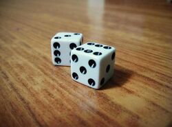 On dice, pips are small dots on each face of a common six-sided die. These pips are typically arranged in patterns denoting the numbers one through six. The sum of opposing faces traditionally adds up to seven. Pips are commonly colored black on white or yellow dice, and white on dice of other colors, although colored pips on white/yellow dice are not uncommon; Asian dice often have an enlarged red single pip for the "one" face, while the dice for the game Kismet feature black pips for 1 and 6, red pips for 2 and 5, and green pips for 3 and 4.