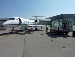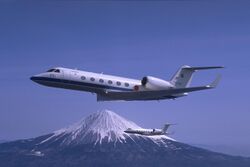 | The Gulfstream IV is a low-wing aircraft with twin aft-mounted turbofans and a T-tail, here in service of the United States Department of Commerce | |