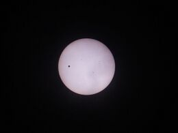 The 2012 transit of Venus, when the planet Venus appeared as a small, dark spot passing across the face of the Sun, began at 22:09 UTC on 5 June 2012, and finished at 04:49 UTC on 6 June.[1] Depending on the position of the observer, the exact times varied by up to ±7 minutes. Transits of Venus are among the rarest of predictable celestial phenomena and occur in pairs. Consecutive transits per pair are spaced 8 years apart, and consecutive pairs occur more than a century apart:[2] The previous transit of Venus took place on 8 June 2004 (preceded by transits on 9 December 1874 and 6 December 1882); the next pair of transits will occur on 10–11 December 2117 and in December 2125.[3]