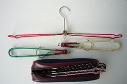 Some hangers have clips along the bottom for suspending skirts. Dedicated skirt and trousers hangers may not use the triangular shape at all, instead using just a rod with clips. Other hangers have little rings coming from the top two bars to hang straps from tank-tops on. Specialized pant hanger racks may accommodate many pairs of trousers. Foldable clothes hangers that are designed to be inserted through the collar area for ease of use and the reduction of stretching are an old, yet potentially useful variation on traditional clothes hangers. They have been patented over 200 times in the U.S. alone, as in U.S. Patent 0586456, awarded in 1897 to George E. Hideout.[1]