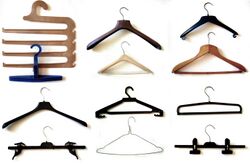 There are three basic types of clothes hangers. The first is the wire hanger, which has a simple loop of wire, most often steel,[citation needed] in a flattened triangle shape that continues into a hook at the top. The second is the wooden hanger, which consists of a flat piece of wood cut into a boomerang-like shape with the edges sanded down to prevent damage to the clothing, and a hook, usually of metal, protruding from the point. Some wooden hangers have a rounded bar from tip to tip, forming a flattened triangle. This bar is designed to hang the trousers belonging to the jacket. The third kind and most used in today's world are plastic coat hangers, which mostly mimic the shape of either a wire or a wooden hanger. Plastic coat hangers are also produced in smaller sizes to accommodate the shapes of children's clothes.