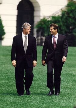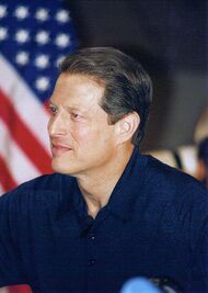 Gore was initially hesitant to be Bill Clinton's running mate for the 1992 United States presidential election, but after clashing with the George H. W. Bush administration over global warming issues, he decided to accept the offer.[29] Clinton stated that he chose Gore due to his foreign policy experience, work with the environment, and commitment to his family.[73][74]