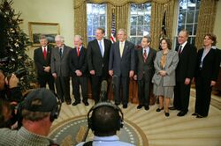 People were speculating that Gore would be a candidate for the 2004 presidential election (a bumper sticker, "Re-elect Gore in 2004!" was popular).[162] On December 16, 2002, however, Gore announced that he would not run in 2004.[163] While Gore seriously considered challenging Bush in 2004, the 9/11 attacks and the subsequent stratospheric rise in President Bush's popularity as a result of his response to these attacks were strong factors in Gore's December 2002 decision not to run again in 2004.[164] Despite Gore taking himself out of the race, a handful of his supporters formed a national campaign to draft him into running. The draft movement, however, failed to convince Gore to run.[165]