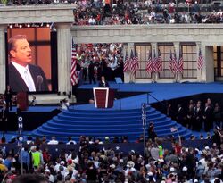 On August 13, 2000, Gore announced that he had selected Senator Joe Lieberman of Connecticut as his vice presidential running mate. Lieberman became "the first person of the Jewish faith to run for the nation's second-highest office". Many pundits saw Gore's choice of Lieberman as further distancing him from the scandals of the Clinton White House.[134] Gore's daughter, Karenna, together with her father's former Harvard roommate Tommy Lee Jones,[135] officially nominated Gore as the Democratic presidential candidate during the 2000 Democratic National Convention in Los Angeles, California.[136] Gore accepted his party's nomination and spoke about the major themes of his campaign, stating in particular his plan to extend Medicare to pay for prescription drugs and to work for a sensible universal health-care system.[136] Soon after the convention, Gore hit the campaign trail with running mate Joe Lieberman. Gore and Bush were deadlocked in the polls.[137] They participated in three televised debates. While both sides claimed victory after each, Gore was critiqued as either too stiff, too reticent, or too aggressive in contrast to Bush.[138][139]