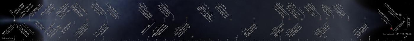 Based on results from the Gaia telescope's second data release from April 2018, an estimated 694 stars will approach the Solar System to less than 5 parsecs in the next 15 million years. Of these, 26 have a good probability to come within 1.0 parsec (3.3 light-years) and another 7 within 0.5 parsecs (1.6 light-years).[3] This number is likely much higher, due to the sheer number of stars needed to be surveyed; a star approaching the Solar System 10 million years ago, moving at a typical Sun-relative 20–200 kilometers per second, would be 600–6,000 light-years from the Sun at present day, with millions of stars closer to the Sun. The closest encounter to the Sun so far predicted is the low-mass orange dwarf star Gliese 710 / HIP 89825 with roughly 60% the mass of the Sun.[4] It is currently predicted to pass 19,300 ± 3,200 astronomical units (0.305 ± 0.051 light-years) from the Sun in 1.280+0.041