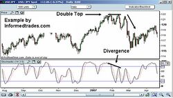 Divergence-convergence is an indication that the momentum in the market is waning and a reversal may be in the making. The chart below illustrates an example of where a divergence in stochastics, relative to price, forecasts a reversal in the price's direction.