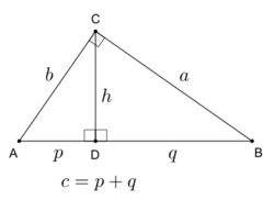 If h denotes the altitude in a right triangle and p and q the segments on the hypotenuse then the theorem can be stated as:[1]