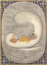 In Hindu mythology Lord Vishnu is said to sleep while floating on the cosmic waters on the serpent Shesha. In the Puranas Shesha holds all the planets of the universe on his hoods and constantly sings the glories of Vishnu from all his mouths. He is sometimes referred to as "Ananta-Shesha," which means "Endless Shesha". In the Samudra manthan chapter of the Puranas, Shesha loosens Mount Mandara for it to be used as a churning rod by the Asuras and Devas to churn the ocean of milk in the heavens in order to make Soma (or Amrita), the divine elixir of immortality. As a churning rope another giant serpent called Vasuki is used.