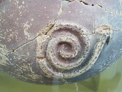 Significant finds of pottery, bronze-ware and even gold depictions of snakes have been made throughout the United Arab Emirates (UAE). The Bronze Age and Iron Age metallurgical centre of Saruq Al Hadid has yielded probably the richest trove of such objects, although finds have been made bearing snake symbols in Bronze Age sites at Rumailah, Bithnah and Masafi. Most of the depictions of snakes are similar, with a consistent dotted decoration applied to them.