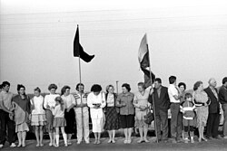 In August of 1989, 2 million citizens of the Baltic republics joined hands to form a human chain across the three states in order to call for independence.[281] Said Juris Kaža, a Latvian-American journalist who filmed the event, "You could literally see that half the country was out in the road and holding hands."[282] The protest became part of the wider Singing Revolution, in which many thousands of Baltic citizens revived their illegal national anthems and waved the banned flags of their nations.[283] Just months later, Lithuania became the first Soviet republic to abolish the communist party's monopoly on power and was followed by its fellow Baltic republics.[284] In the same year, Soviet troops massacred 16 protesters, mostly young women, in the Georgian Soviet Republic.[285]