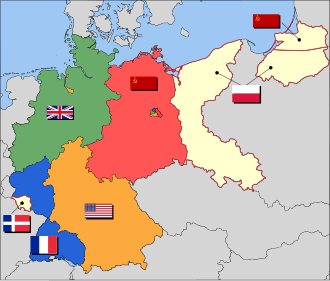 In response to the creation of a West German state, the Soviets held sham elections in their own occupation zone. Voters used non-secret ballots and could only choose among communist-controlled parties.[55] In fall 1949, the German Democratic Republic came into existence.[56][note 2]
