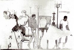 Aita is a relatively late addition to the Etruscan pantheon, appearing in iconography and in Etruscan text beginning in the 4th century BC, and is heavily influenced by his Greek counterpart, Hades.[7] Aita is pictured in only a few instances in Etruscan tomb painting, such as in the Golini Tomb from Orvieto and the tomb of Orcus II from Tarquinia. In these tomb paintings, he is shown with his consort Persipnei (Template:Lang-ett), also spelled Phersipnai (Template:Lang-ett), the Etruscan equivalent to the Greek Persephone.