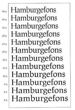 A set of optical sizes developed at URW of the typeface Leipziger Antiqua. The letters become higher in x-height and more widely spaced as the point size for which they are intended decreases.
