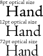 - Optical size allows the character shape to be modified based on how large it will appear to the reader. At small sizes, small details such as serifs and thin lines such as stems are typically bolder. The "x-height" (the height of a lower case "x") is also a larger proportion of the total font height, and the characters may be extended slightly. These changes are designed to make small type easier to read. At larger sizes, these details can be finer and the lines more delicate. Note that the optical size is independent from the actual size of the type. It is up to the user to pick the appropriate optical size for the application and viewing environment (for example, a billboard would want to use small optical size even for extremely large text).