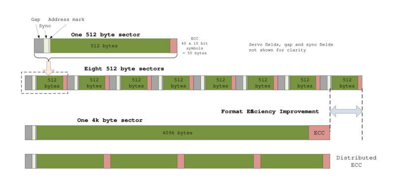 Format efficiency gains resulting from the 4K sector structure range from 7 to 11 percent in physical platter space.[9] The 4K format provides enough space to expand the ECC field from 50 to 100 bytes to accommodate new ECC algorithms. The enhanced ECC coverage improves the ability to detect and correct processed data errors beyond the 50-byte defect length associated with the 512-byte sector legacy format.[10] The Advanced Format standard employs the same gap, sync and address mark configuration as the traditional 512-byte sector layout, but combines eight 512-byte sectors into one data field.[11]