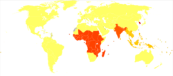As of 2022, about 40 million people were infected, and about 863 million people were at risk of the disease in 47 countries.[5] It is most common in tropical Africa and Asia.[2] Lymphatic filariasis is classified as a neglected tropical disease and one of the four main worm infections.[10] The impact of the disease results in economic losses of billions of dollars a year.[2]
