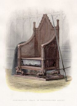 The Stone of Scone, the ancient specific stone upon which Scottish monarchs had been crowned, was taken from Scone near Perth, Scotland, by troops of King Edward I of England (Longshanks) in 1296 during the Scottish Wars of Independence as a spoil of war, kept in Westminster Abbey in London and fitted into King Edward's Chair.[5] Subsequent English and then British monarchs were crowned sitting upon the chair and Stone.[5] At the time, the Stone was viewed as a symbol of Scottish nationhood; by removing the Stone to London, Edward I was declaring himself 'King of the Scots'.[6]