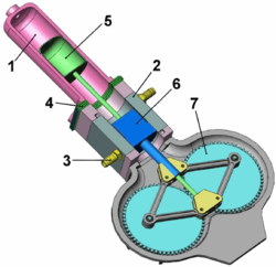 Design of the flat double-acting Stirling engine solves the drive of a displacer with the help of the fact that areas of the hot and cold pistons of the displacer are different.[citation needed]