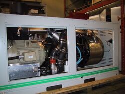 With his brother James, Stirling patented a second hot air engine in 1827.[11] They inverted the design so that the hot ends of the displacers were underneath the machinery, and they added a compressed air pump so the air within could be increased in pressure to around 20 standard atmospheres (2,000 kPa).[citation needed]