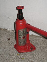 A bottle jack or whiskey jack[6] is a jack which resembles a bottle in shape, having a cylindrical body and a neck. Within is a vertical lifting ram with a support pad of some kind fixed to the top. The jack may be hydraulic or work by screw action. In the hydraulic version, the hydraulic ram emerges from the body vertically by hydraulic pressure provided by a pump either on the baseplate or at a remote location via a pressure hose. With a single action piston the lift range is somewhat limited, so its use for lifting vehicles is limited to those with a relatively high clearance. For lifting structures such as houses the hydraulic interconnection of multiple vertical jacks through valves enables the even distribution of forces while enabling close control of the lift.