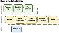 - Approach–Refers to the stage when the salesperson initially meets with the customer. Since first contact leaves an impression on the buyer, professional conduct, including attire, a handshake, and eye contact, is advised.[20]