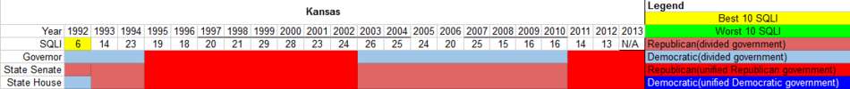 The chart below shows the partisan composition of the Office of the Governor of Kansas, the Kansas State Senate and the Kansas House of Representatives from 1992 to 2013.