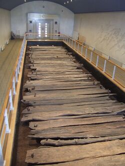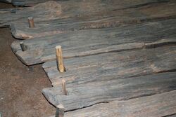 The majority of these toghers are constructed from woven hurdles laid on heaped brushwood on top of the surface, built to be used by people on foot. Four, including Corlea 1, the Corlea Trackway proper, are corduroy roads, built from split planks laid on top of raised rails and suitable for wheeled traffic. The Corlea Trackway is made from oak planks 3 to 3.5 metres (9.8 to 11.5 ft) long and around 15 cm (5.9 in) thick laid on rails around 1.2 metres (3 ft 11 in) apart. The road was at least 1 km (0.62 mi) long. Dendrochronological study suggests that the timber used in construction was felled in late 148 BC or early in 147 BC and the road built then. Raftery estimated that the sleepers alone amount to a 300 large oak trees, or a thousand wagon-loads, with a similar volume of birch for the rails.[5] The Corlea Trackway ended on a small island, from which a second trackway, excavated in 1957 and since radiocarbon dated also to 148 BC, again around 1 kilometre long, connected to dry land on the far side of the bog.[3] The construction of the roadway required a great deal of labour, comparable to that used in the construction of ritual monuments such as barrows.[6]