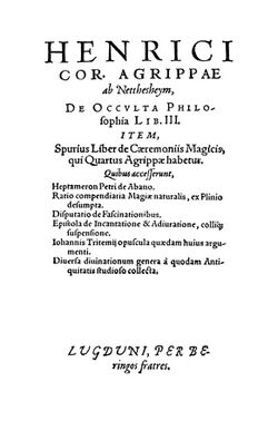 Three Books of Occult Philosophy (De Occulta Philosophia libri III) is Heinrich Cornelius Agrippa's study of occult philosophy, acknowledged as a significant contribution to the Renaissance philosophical discussion concerning the powers of magic, and its relationship with religion. The first book was printed in 1531 in Paris, Cologne, and Antwerp, while the full three volumes first appeared in Cologne in 1533.[1]