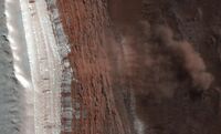 A rock avalanche, sometimes referred to as sturzstrom, is a large and fast-moving landslide of the flow type. It is rarer than other types of landslides but it is often very destructive. It exhibits typically a long runout, flowing very far over a low-angle, flat, or even slightly uphill terrain. The mechanisms favoring the long runout can be different, but they typically result in the weakening of the sliding mass as the speed increases.[30][31][32] The causes of this weakening are not completely understood. Especially for the largest landslides, it may involve the very quick heating of the shear zone due to friction, which may even cause the water that is present to vaporize and build up a large pressure, producing a sort of hovercraft effect.[33] In some cases, the very high temperature may even cause some of the minerals to melt.[34] During the movement, the rock in the shear zone may also be finely ground, producing a nanometer-size mineral powder that may act as a lubricant, reducing the resistance to motion and promoting larger speeds and longer runouts.[35] The weakening mechanisms in large rock avalanches are similar to those occurring in seismic faults.[32]