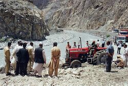 Slope material that becomes saturated with water may produce a debris flow or mud flow. However, also dry debris can exhibit flow-like movement.[28] Flowing debris or mud may pick up trees, houses and cars, and block bridges and rivers causing flooding along its path. This phenomenon is particularly hazardous in alpine areas, where narrow gorges and steep valleys are conducive of faster flows. Debris and mud flows may initiate on the slopes or result from the fluidization of landslide material as it gains speed or incorporates further debris and water along its path. River blockages as the flow reaches a main stream can generate temporary dams. As the impoundments fail, a domino effect may be created, with a remarkable growth in the volume of the flowing mass, and in its destructive power.