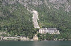 Hotel Panorama at Lake Garda. Part of a hill of Devonian shale was removed to make the road, forming a dip-slope. The upper block detached along a bedding plane and is sliding down the hill, forming a jumbled pile of rock at the toe of the slide.