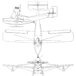 The wings were mounted on top of the hull with 5° of dihedral, had blunted rectangular plans and were swept at 3.5°. They were built around spruce spars and alloy ribs and were fabric covered. Steel tube structured, canvas covered ailerons filled most of the trailing edges. A pair of flat-sided and -bottomed floats towards the wingtips provided stability on the water.[1] These were replaced on the P-3 with better streamlined floats.[2]