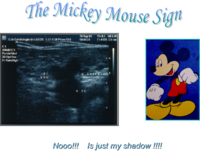 - Pelvic Mickey Mouse sign: bilateral inguinal vesical hernia on transverse axial imaging.[5]
