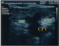 Some authors, inspired by this sign, described an ecographic "Mickey Mouse View" at the saphenofemoral junction in the groin: the common femoral vein (CFV) represents the head of Mickey Mouse while the great saphenous vein (GSV) and the accessory saphenous vein (ASV) represent the ears.[1]