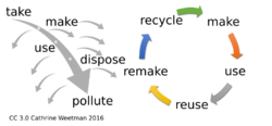 Sustainable business practices integrate ecological concerns with social and economic ones.[16][17] One accounting framework for this approach uses the phrase "people, planet, and profit". The name of this approach is the triple bottom line. The circular economy is a related concept. Its goal is to decouple environmental pressure from economic growth.[95][96]