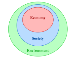 Some scholars place social issues at the very center of discussions.[59] They suggest that all the domains of sustainability are social. These include ecological, economic, political, and cultural sustainability. These domains all depend on the relationship between the social and the natural. The ecological domain is defined as human embeddedness in the environment. From this perspective, social sustainability encompasses all human activities.[60] It goes beyond the intersection of economics, the environment, and the social.[61]
