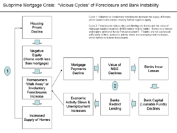 The contemporary subprime mortgage crisis is a complex group of vicious circles, both in its genesis and in its manifold outcomes, most notably the late 2000s recession. A specific example is the circle related to housing. As housing prices decline, more homeowners go "underwater", when the market value of a home drops below that of the mortgage on it. This provides an incentive to walk away from the home, increasing defaults and foreclosures. This, in turn, lowers housing values further from over-supply, reinforcing the cycle.[2]