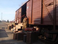 The standard means of transport was a 10-metre long (32 ft 9 3⁄4 in) freight car, although third class passenger carriages were also used when the SS wanted to keep up the "resettlement to work in the East" myth, particularly in the Netherlands and in Belgium. The SS manual covered such trains, suggesting a carrying capacity per trainset of 2,500 people in 50 cars, each boxcar loaded with 50 prisoners. In reality, however, boxcars were routinely loaded to 200% of capacity or 100 people per car.[40] This resulted in an average of 5,000 people per trainset. During the mass deportation of Jews from the Warsaw Ghetto to Treblinka in 1942, trains carried up to 7,000 victims each.[41]