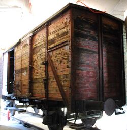 The trains sometimes consisted of third class passenger carriages,[25] but more commonly freight cars or cattle cars; the latter packed with up to 150 deportees, although 50 was the number proposed by the SS regulations. No food or water was supplied. The Güterwagen boxcars were fitted with only a bucket latrine. A small barred window provided irregular ventilation, which oftentimes resulted in multiple deaths from either suffocation or exposure to the elements.[26]