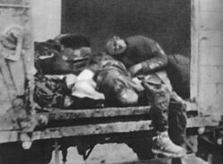 ![]() Polish Jews being loaded onto trains at Umschlagplatz of the Warsaw Ghetto, 1942. The site is preserved today as a Polish national monument. | |