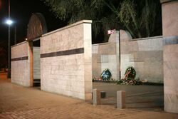 All railway lines leading to death camps built in occupied Poland are ceremonially cut off from the existing railway system in the country, similar to the well-preserved arrival point at Auschwitz known as the "Judenrampe" platform. The commemorative monuments are traditionally erected at collection points elsewhere. In 1988, a national monument was created at the Umschlagplatz of the Warsaw Ghetto. Designed by architect Hanna Szmalenberg and sculptor Władysław Klamerus, it consists of a stone structure symbolizing an open freight car.[152] In Kraków, the memorial to Jews from the Kraków Ghetto deported during the Holocaust spreads over the entire deportation site known as the Square of the Ghetto Heroes (Plac Bohaterow Getta). Inaugurated in December 2005, it consists of oversized steel chairs (each representing 1,000 victims), designed by architects Piotr Lewicki and Kazimierz Latak.[153] At the former Łódź Ghetto, the monument was built at the Radegast train station (Bahnhof Radegast), where approximately 200,000 Polish, Austrian, German, Luxemburg and Czech Jews boarded the trains on the way to their deaths in the period from 16 January 1942, to 29 August 1944.[154][155]