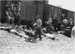 Bulgaria joined the Axis powers in March 1941 and took part in the invasion of Yugoslavia and Greece.[56] The Bulgarian government set up transit camps in Skopje, Blagoevgrad and Dupnitsa for the Jews from the former Serbian province of Vardar Banovina and Thrace (today's North Macedonia and Greece).[56] The "deportations to the east" of 13,000 inmates,[57] mostly to Treblinka extermination camp began on 22 February 1943, predominantly in passenger cars.[58] In four days, some 20 trainsets departed under severely overcrowded conditions to occupied Poland requiring each train to stop daily to dump the bodies of Jews who died during the previous 24 hours.[43] In May 1943, the Bulgarian government led by King Boris III expelled 20,000 Jews from Sofia and at the same time, made plans to deport Bulgaria's Jews to the camps pursuant to an agreement with Germany.[58] A Holocaust train from Thrace was witnessed by Stefan I, the Metropolitan Bishop of Sofia, who was shocked by what he saw.[59] Ultimately, the Jews of Bulgaria proper were not deported.[59]