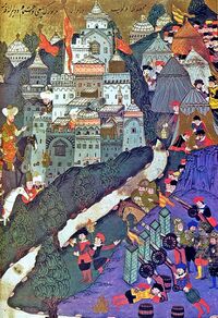 Under Ivan IV (1533–1584), the Tsardom of Russia expanded into the Volga and Caspian regions at the expense of the Tatar khanates. In 1571, the Crimean khan Devlet I Giray, commanded by the Ottomans, invaded Russia and burned Moscow.[83] The next year, the invasion was repeated but repelled at the Battle of Molodi. The Ottoman Empire and its vassal, the Crimean Khanate, continued to invade Eastern Europe in a series of slave raids,[84] and remained a significant power in Eastern Europe until the end of the 17th century.[85] The Crimean cavalry became indispensable for the Ottomans' campaigns against Russia, Poland, Hungary, and Persia.[86]