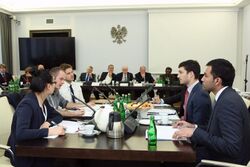 The ministers of foreign affairs of the United States, the United Kingdom, Russia, Germany, France, China, the European Union and Iran negotiating in Lausanne for a Comprehensive agreement on the Iranian nuclear programme (30 March 2015).