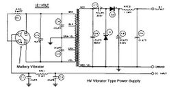 The primary use for this type of circuit was to operate vacuum tube radios in vehicles, but it also saw use with other mobile electronic devices with a 6 or 12 V accumulator, especially in places with no mains electricity supply such as farms. These vibrator power supplies became popular in the 1940s, replacing more bulky motor-generator systems for the generation of AC voltages for such applications.[2][3] Vacuum tubes require plate voltages ranging from about 45 volts to 250 volts in electronic devices such as radios. For portable radios, hearing aids and similar equipment, B batteries were manufactured with various voltage ratings. In order to provide the necessary voltage for a radio from the typical 6 or 12 volt DC supply available in a car or from a farm lighting battery, it was necessary to convert the steady DC supply to a pulsating DC and use a transformer to increase the voltage.
